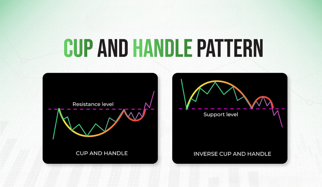 The cup and Handle pattern is one of the prominent patterns in technical analysis. It is of two types; cup and handle and inverted cup and handle pattern. The cup and handle pattern helps in signaling the uptrend in the chart. Whereas, the inverted cup and handle pattern help in signaling the downtrend in the chart.